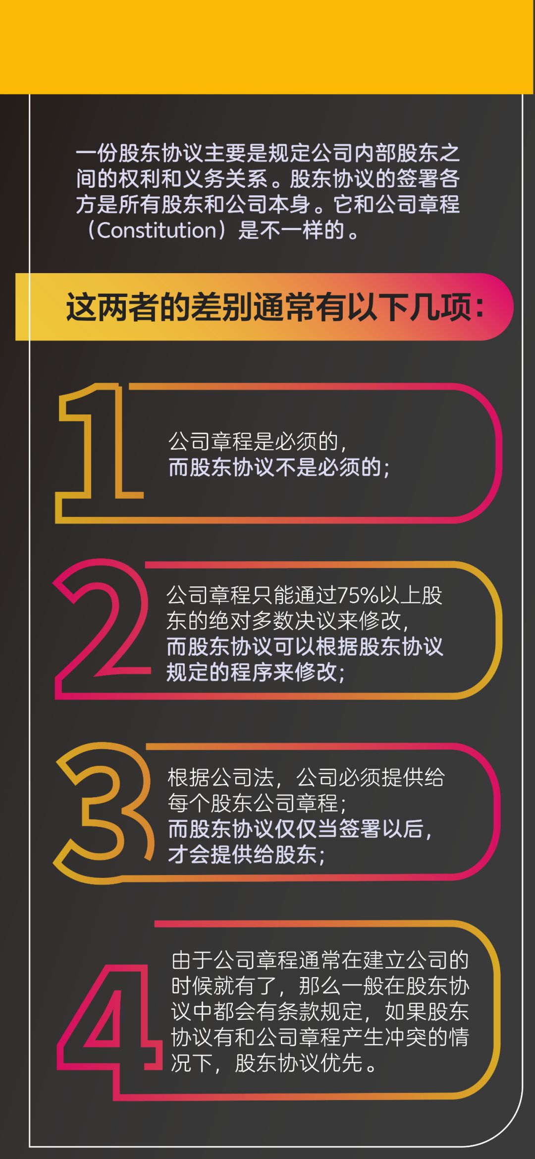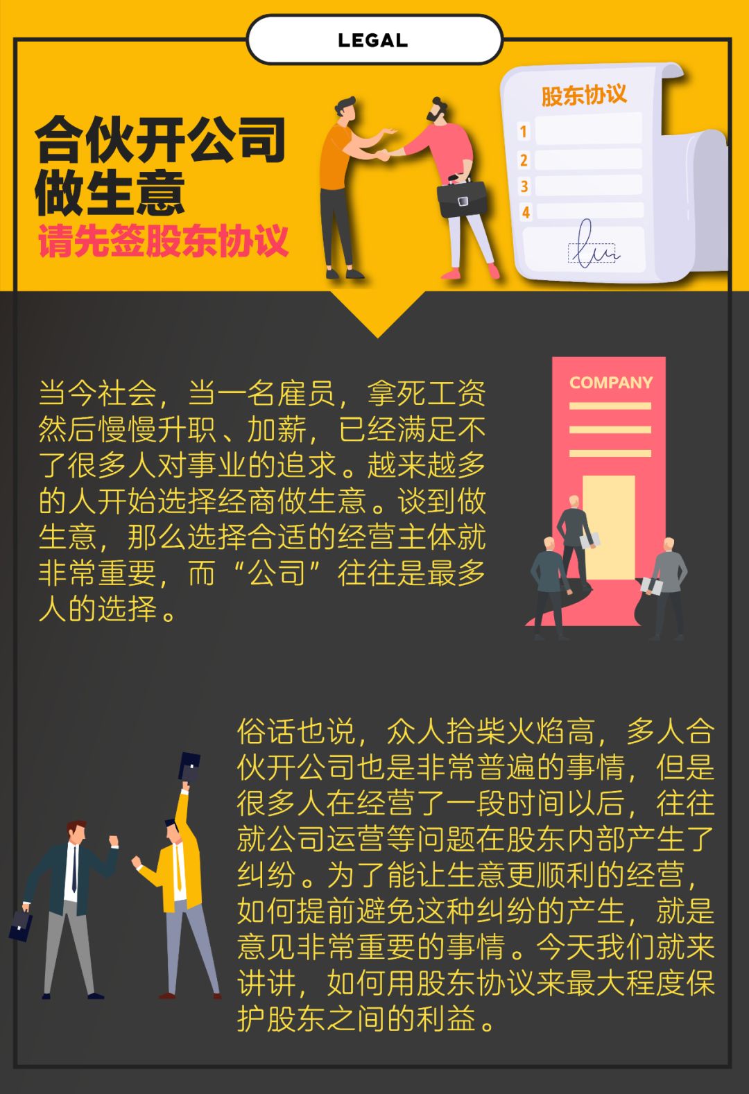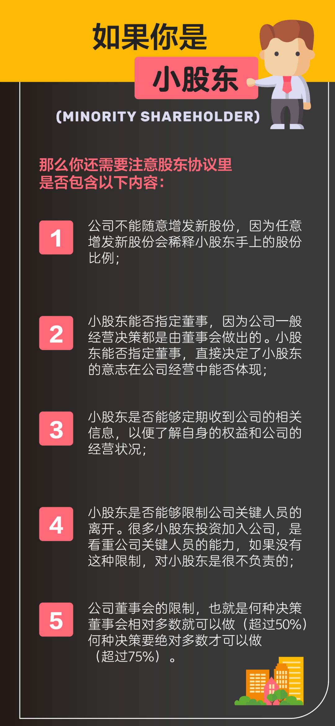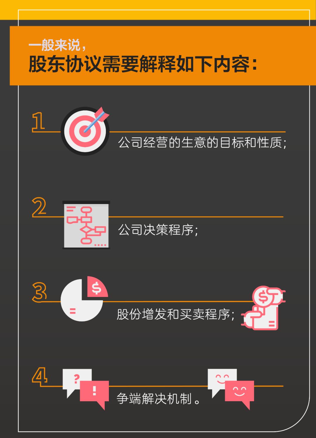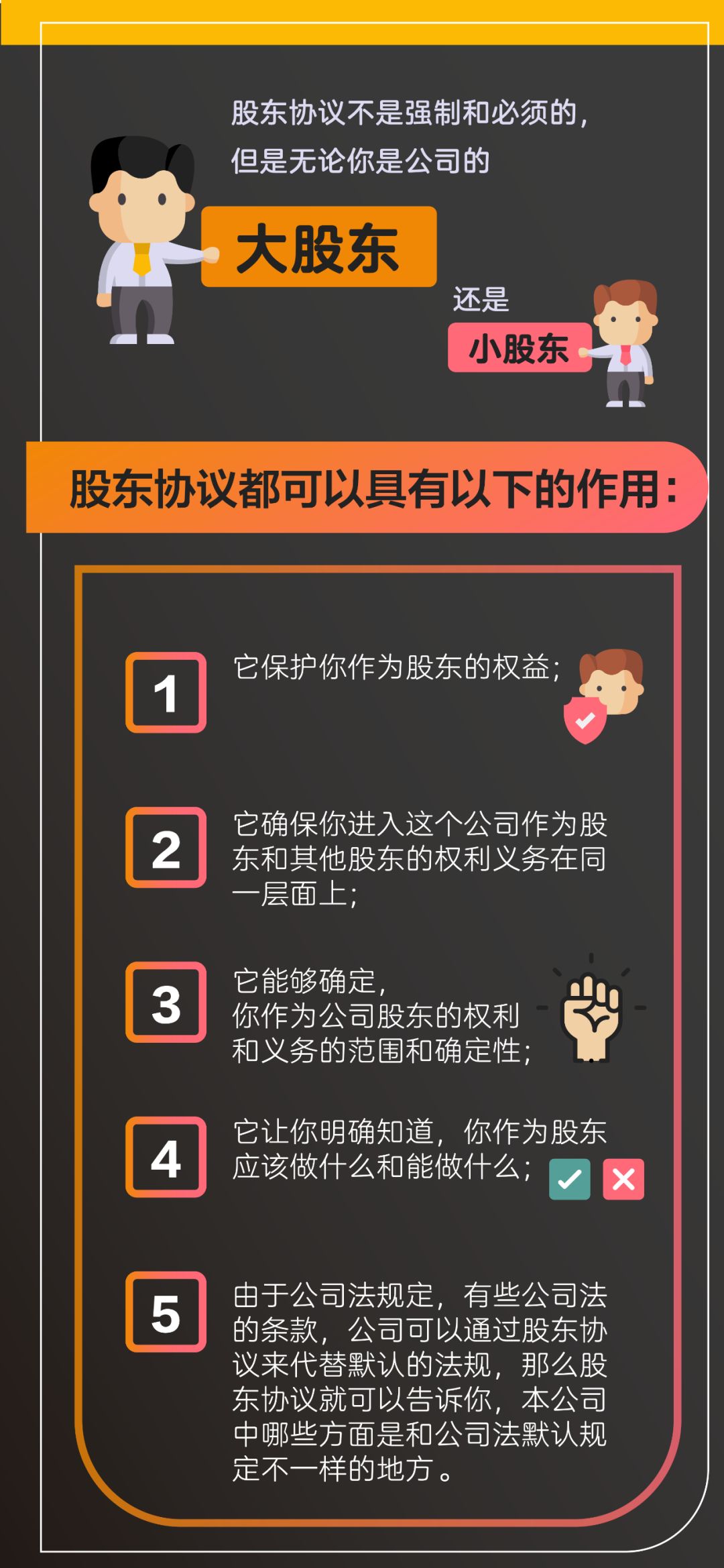 以上就是股东协议的基本内容和作用。古人有云:“未雨而绸缪”。很多合作者,在公司成立的时候“哥俩好”,认为不需要额外签订股东协议。但是只有在争端未出现的时候,就互相确定好权利义务关系,才能让合作更顺利进行。作为律师,我们相信,股东协议可以更好的促进公司股东们的合作,也能使公司的运营更为顺畅,最终使公司和股东各方都能受益。