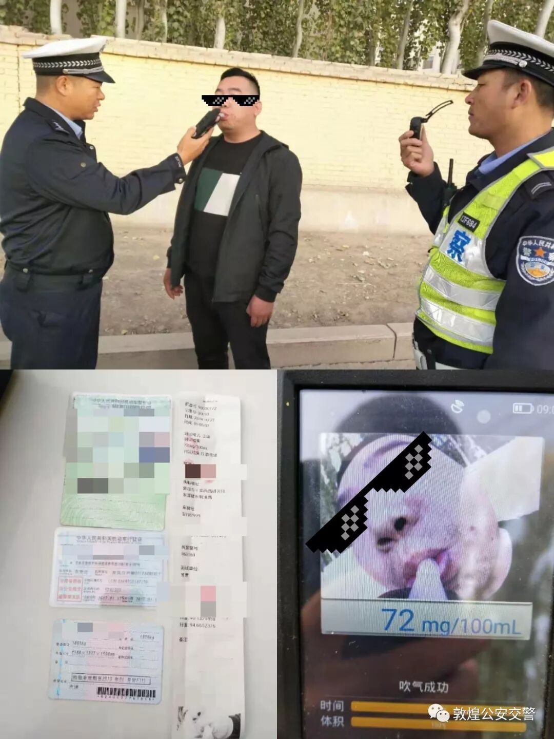 27日上午9时许,敦煌市公安局交警大队转渠口中队在干渠西路查处一起饮酒驾驶机动车严重道路交通违法行为。经对违法行为人刘XX呼气式酒精检测仪检测结果为72mg/100ml,系饮酒驾驶。