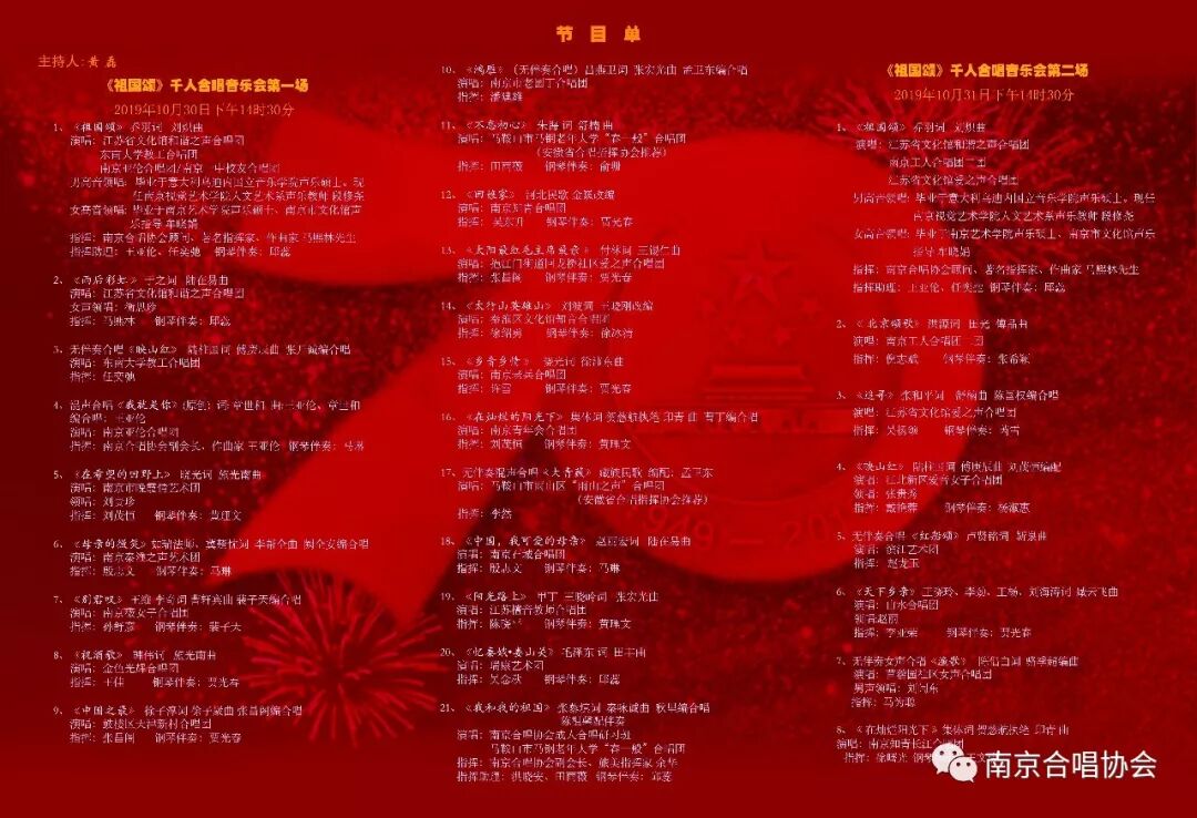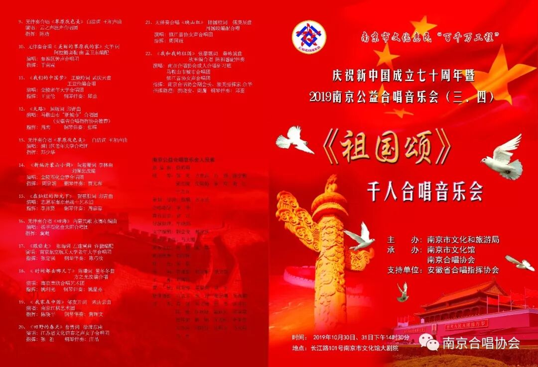 为庆祝新中国成立70周年,由南京市文化和旅游局主办、南京市文化馆与南京合唱协会承办的2019南京公益合唱音乐会第三场和第四场将分别举办两场《祖国颂》千人合唱音乐会,将于2019年10月30日与31日在南京长江路南京市文化馆大剧院举行,参加对象为南京地区社会合唱团队,同时欢迎南京周边兄弟省市合唱团队来宁展演。