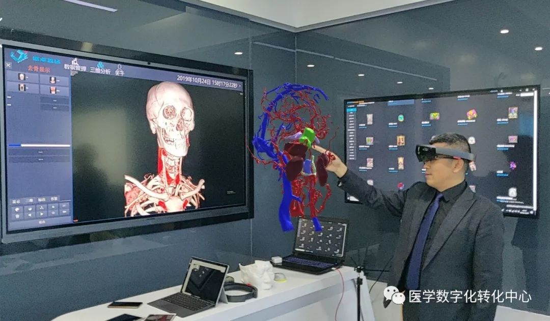星图-全息影像工作站。如果大屏幕观察还不能完整清晰弄明白,需要实时的术中与真实个案比对,那么全息的观察必不可少了,带上全息眼镜,主刀与助手全息下沟通,相当于手术预演。术中实时对照全息,透明人-透明器官,一切可见,有限的暴露,足够的视野,真正的精准外科。
