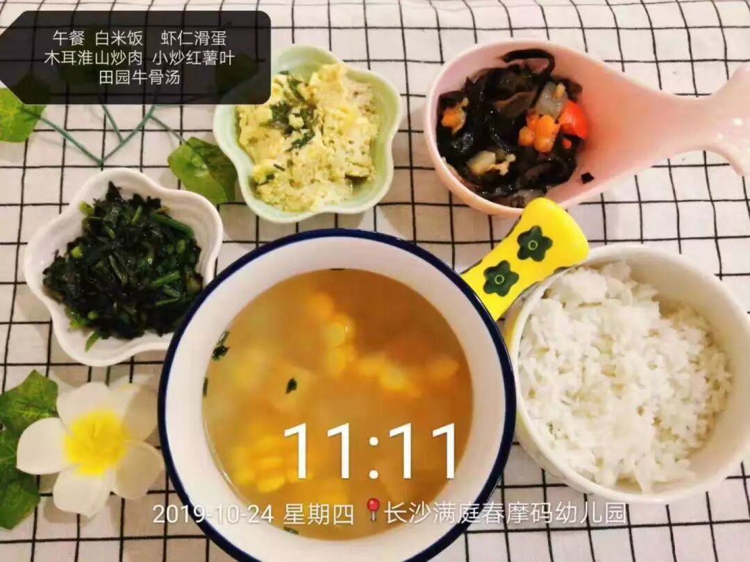 午餐:金银米饭/彩色鱿鱼丝/黄瓜炒鸡蛋/蒜蓉空心菜/田园脊骨汤