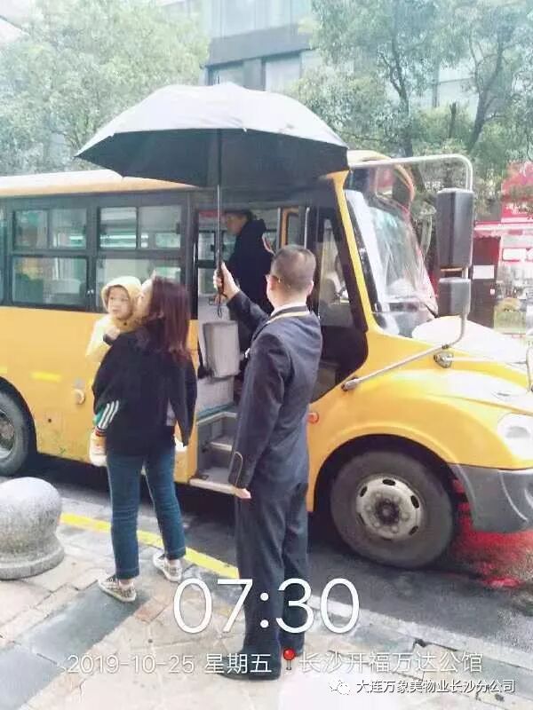 维护幼儿园校车周边秩序,主动帮业主送小孩上车