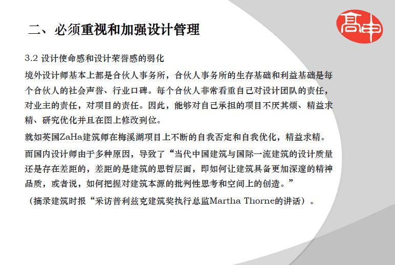 王炳国老师着重谈了梅溪湖工程设计管理中的经验和教训,强调要重视和抓住每一个对设计水准和设计质量具有重要作用的设计环节。包括:在可行性研究基础上的二次深度策划;设计任务书的专业化、阶段化和精细化;搭建安全和有效率的设计组织架构;设计团队的组成;设计团队的选择方法;设计团队的设计范围和设计界面;设计团队合适的进场时间(在具有条件下,越早越好);国内外设计标准的选用和协调;设计造价的确定;建筑设计竞赛方案的优化组织;建筑师在建设全过程对建筑效果把控责任(相当于建筑师的建筑效果负责制);各个阶段设计成果交付物的质量管理;严格管控设计变更;施工阶段的设计配合的方法和责任;施工图深化设计的组织和认定;主要工程材料设备的认定;技术核定单和施工签证的认定;驻场设计代表发挥作用和监管;设计合同的管理等。