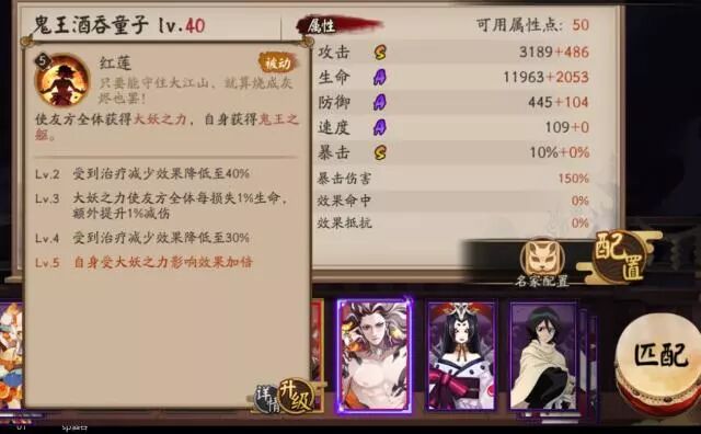 一技能bt之外,被动也是不遑多让。sp酒吞让友方全体获得大妖之力,自己获得鬼王之躯(他自己不是鬼王吗?我表示不知)。这个全体效果是不能叠加的,也就是说多个sp酒吞上场也只有这一个效果。大妖之力的效果:每损失1%生命值,就会增加1%伤害,增加1%减伤(想起残血战神小小黑了吗)。鬼王之躯效果:自己不受控制效果的影响,但是自己受到的治疗效果会下降,满级被动是下降30%。但大妖之力对自己的效果会翻倍。第一个不受一系列烦人控制的式神终于出现了,你还在为魅惑,眩晕,冰冻……而烦恼吗?选sp酒吞就对了!