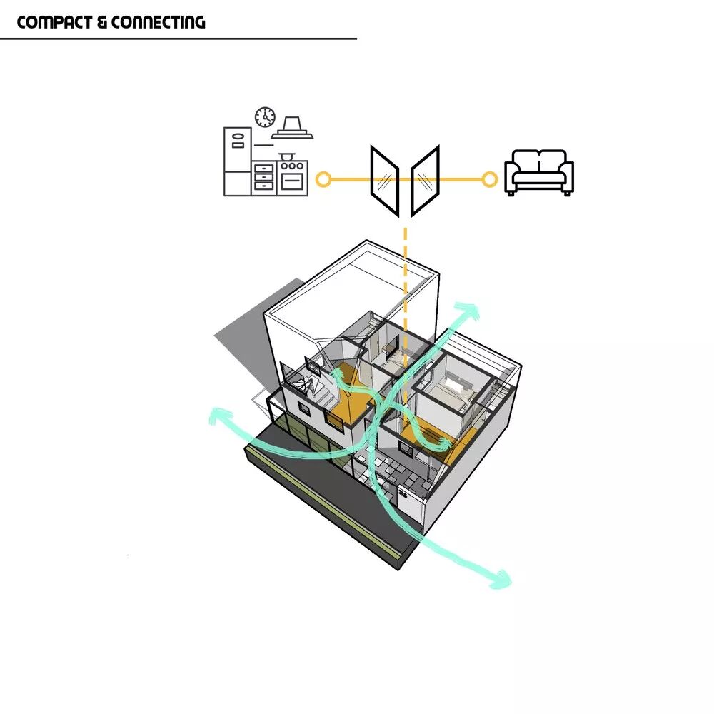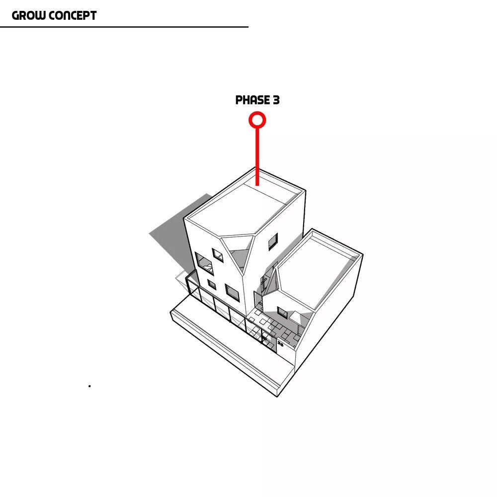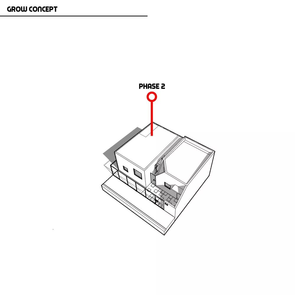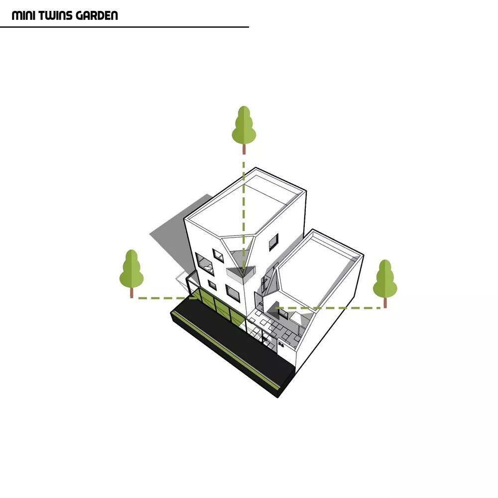 另一侧的住宅则配置了一个带卫生间的卧室和一个起居室。公共空间将这个狭小的用地组织起来,使底层场地能够被灵活流动地利用。双生宅之中,每一个家庭都有着各自的私密区域,但同时依旧能够互相交流。经由通过两栋建筑的入口的相对关系,公共空间被联为了一体。