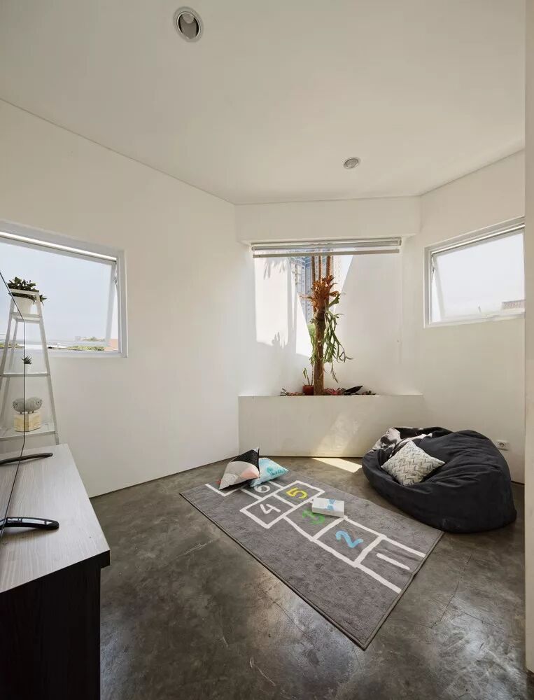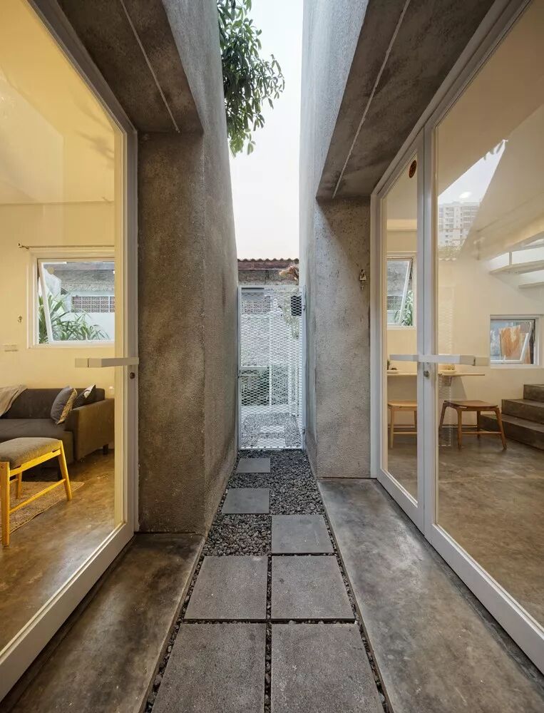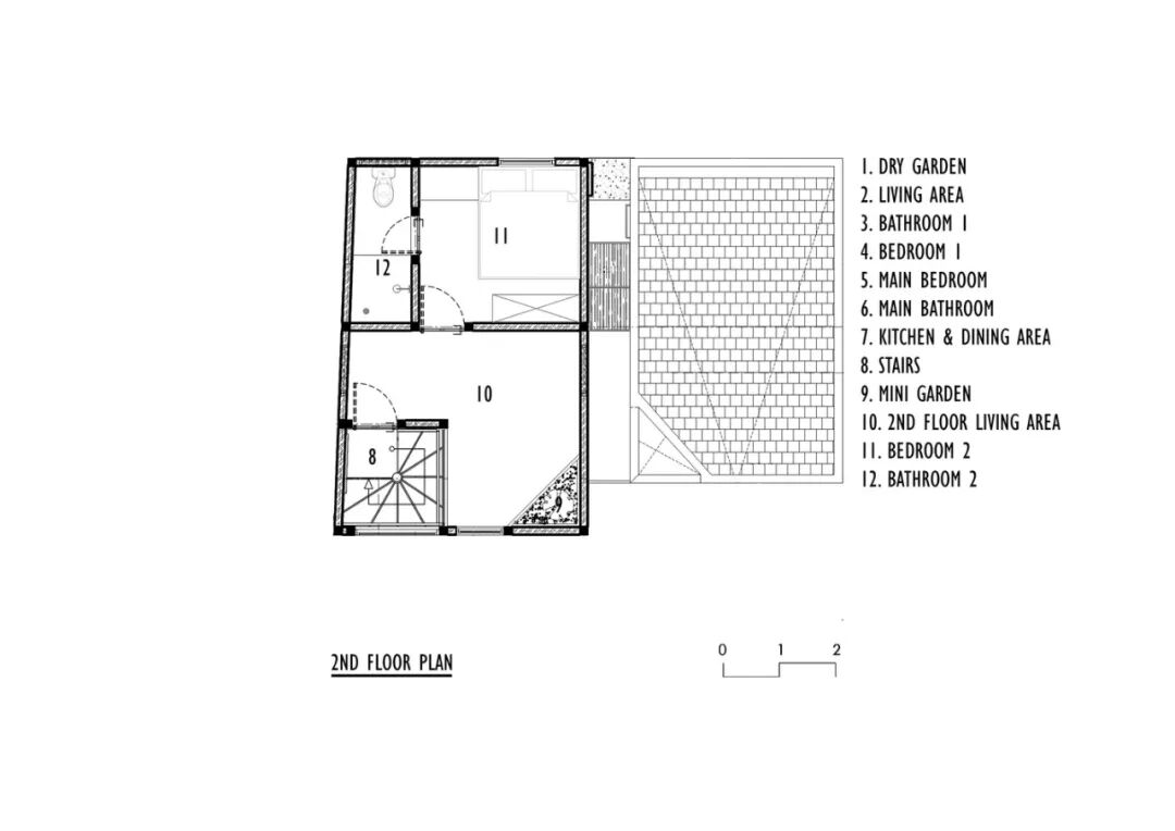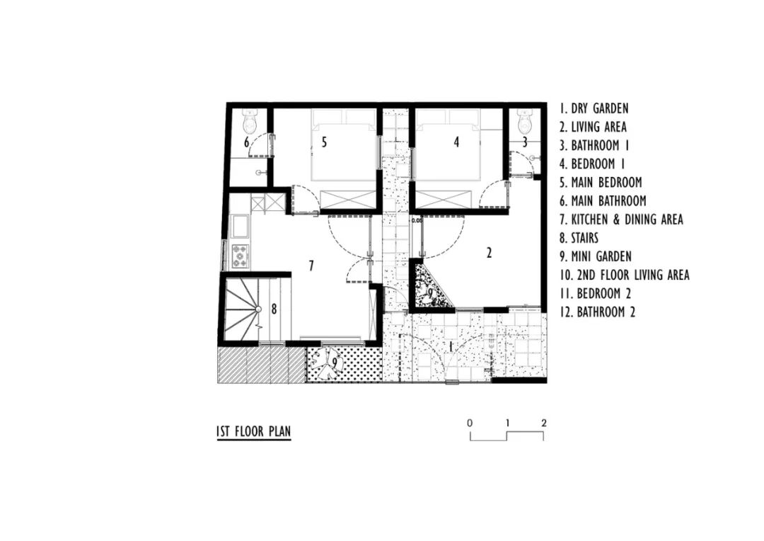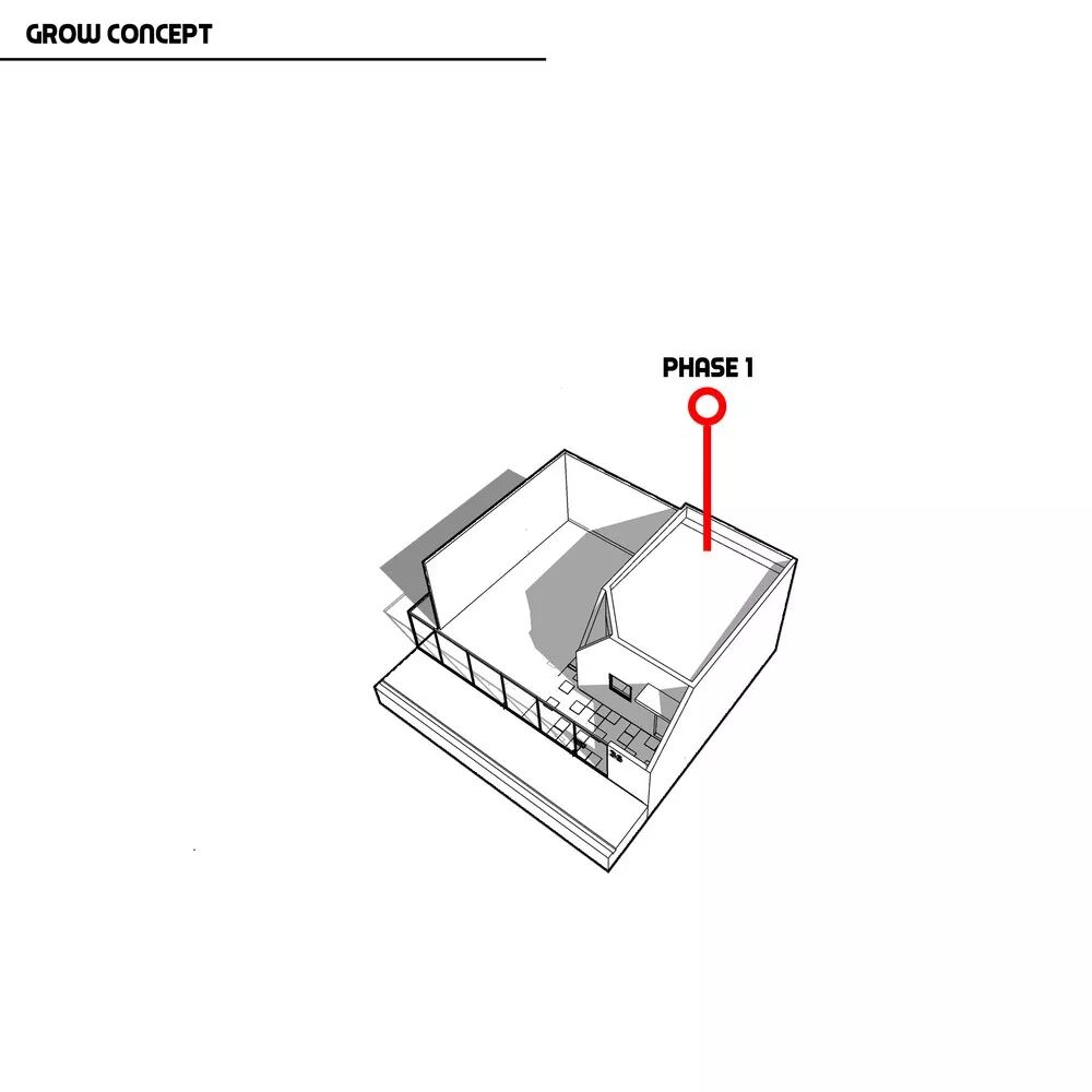 另一侧的住宅则配置了一个带卫生间的卧室和一个起居室。公共空间将这个狭小的用地组织起来,使底层场地能够被灵活流动地利用。双生宅之中,每一个家庭都有着各自的私密区域,但同时依旧能够互相交流。经由通过两栋建筑的入口的相对关系,公共空间被联为了一体。