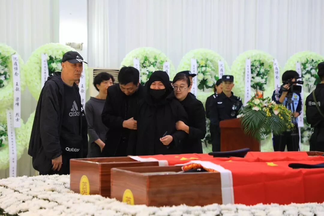 全体人员面色凝重,肃立默哀,向烈士遗体三鞠躬作最后告别,依次围着王歆、梁峰烈士灵柩缓缓绕行一周,并与烈士家属一一握手,表示深切慰问。