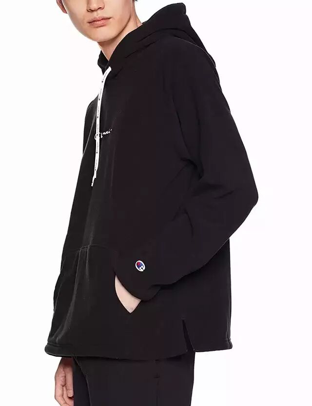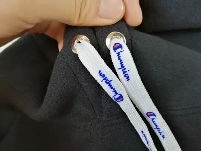 卫衣帽子是连帽抽绳的设计 帽围处是双层的包边和织带的包裹 让帽子边缘更加美观 也更加舒适 白色带有champion串标的抽绳 非常的漂亮 为纯色的衣服增添了一丝色彩 显得有活力了起来