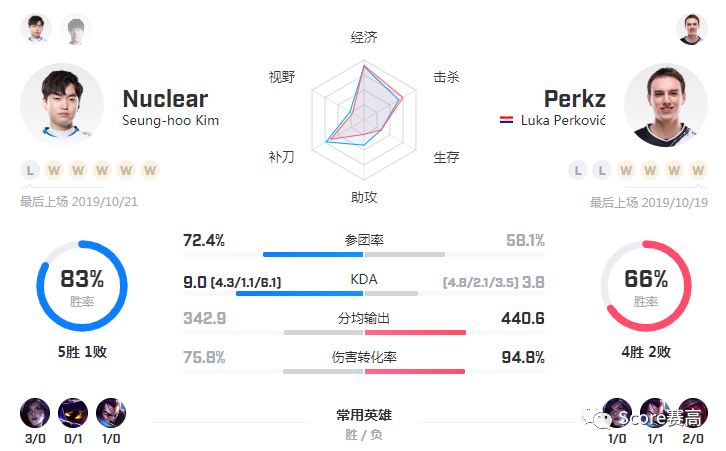 从综合数据上看,Caps在各方面也是领先于ShowMaker,ShowMaker的刺客英雄或许能给Caps造成一定的威胁,但从小组赛表现来看,Caps如今已经成为队内最为稳定的Carry点,再加上更加优势的比赛经验,中路实力上Caps有着绝对的优势。