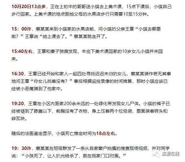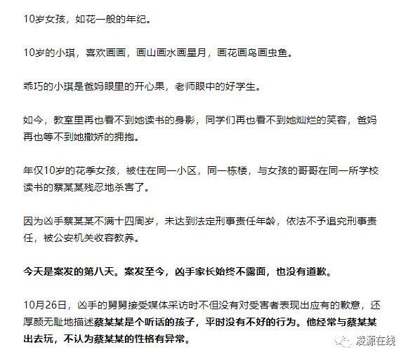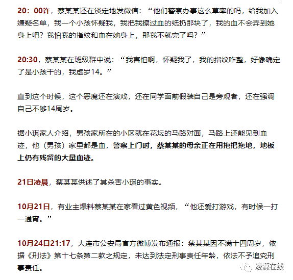 据悉,凶手蔡某虽然还不足14周岁,但身高一米七以上,体重140斤左右,平时有多次骚扰女生、跟踪骚扰成年女性的前科,最终对一个10岁女孩捅出罪恶的七刀。