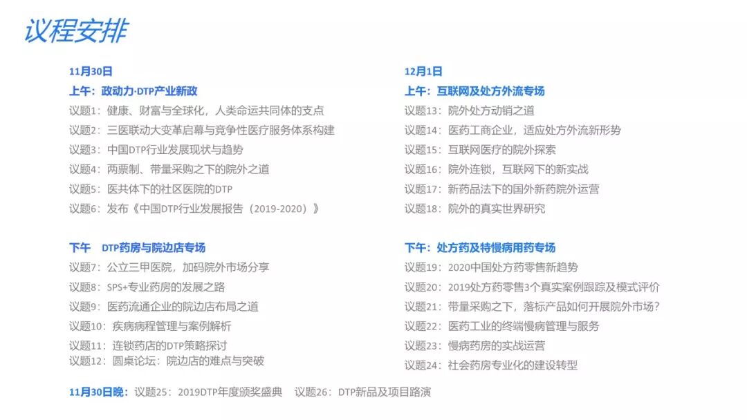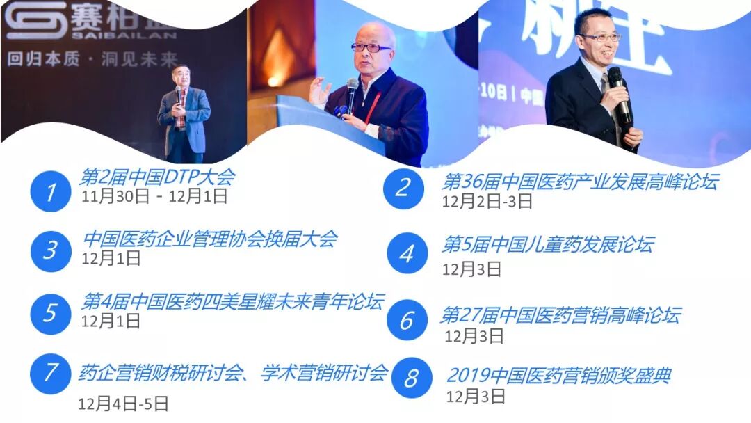 论坛期间,还将举办中国医药企业管理协会换届大会、第2届中国DTP大会、第3届中国医药四美星耀未来青年论坛、第27届中国医药营销高峰论坛暨2019中国医药十大营销案例颁奖盛典、第5届中国儿童用药发展论坛暨儿童药100发布会、2019医药企业营销财税合规研讨会、2020药品学术营销与推广研讨会等系列会议。会议主要安排如下: