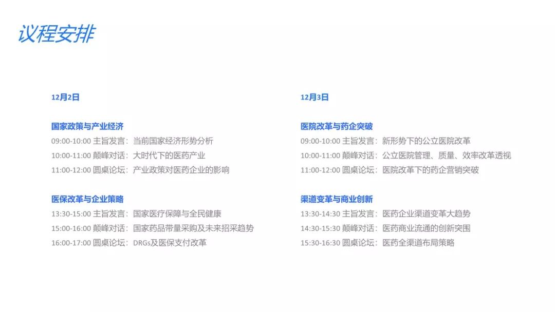 本届论坛以“高质量·再出发”为主题,将重点阐述国家宏观经济背景下的中国医保、医药、医疗政策及对药企的影响与企业应对策略。