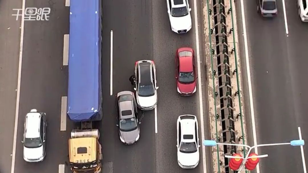 10月23日,陕西西安。刘先生开车在西安绕城高速内环上和一车发生剐蹭,一无人机在上空喊话让两人尽快撤离。