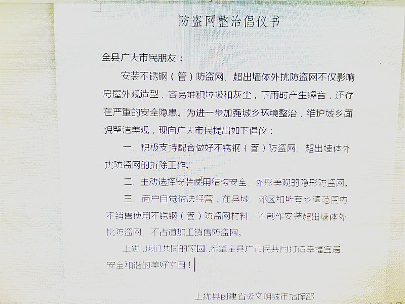 依据《江西省城乡规划条例》、《江西省城市市容和环境卫生管理实施办法》和《上犹县城区综合管理办法》,今年5月份起,上犹县下大力度集中开展了防盗网专项整治工作,重点突出宣传引导、专项整治、联合执法“三个到位”,有力推进了防盗网专项整治工作,有效改善了城乡面貌,保障了市民居住安全。