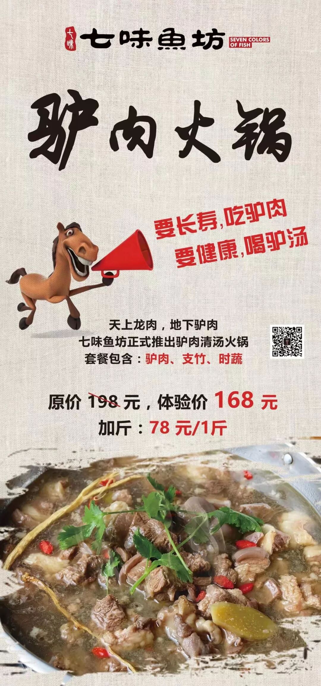 活动三:天上龙肉,地下驴肉,驴肉清汤火锅套餐(包含驴肉、腐竹、时蔬),原价198元,超值体验价168元,(加斤优惠价:78元/斤)。