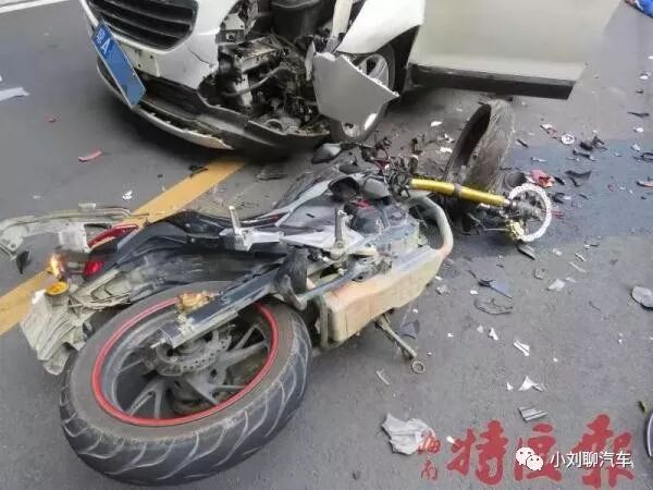 网友提供的视频显示,一辆白色小轿车的左前车头位置受损严重,倒在一旁的摩托车支离破碎,许多车辆零件散落在道路上。