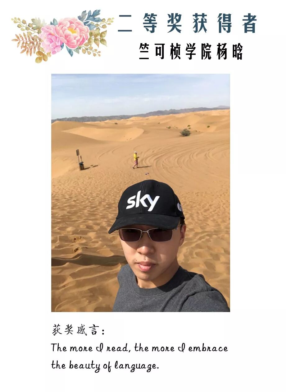 在外语学院方富民老师、周颂波老师和潘珣祎老师的精心指导下,来自我校地球科学学院地质学专业的朱昶禹同学和外语学院英语专业的章佳颖同学在全省55所高校的216位同学中脱颖而出,分别获得了全省第一名和第二名的佳绩,将作为全省前三名的获奖选手入围在北京举行的全国大学生英语阅读总决赛。同时,外语学院谢梦璐同学和医学院杨天璇同学获得了一等奖,竺可桢学院杨晗同学获得了二等奖。