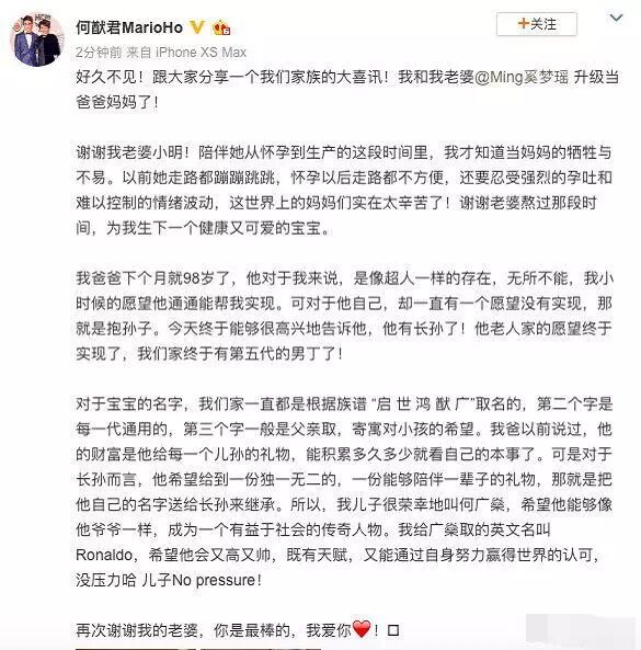 前日何猷君为在微博跟大家分享了这个好消息,自己从丈夫升级成为了父亲,而且奚梦瑶生的还是儿子,98岁赌王的愿望终于实现了。