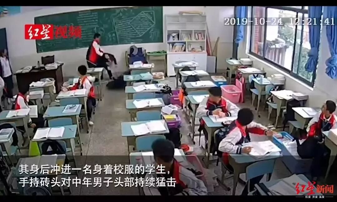 10月25日,一段视频正在网上流传,视频中显示在一间教室里,一名身穿便服的男子走进教室后,一名身穿校服模样的少年用砖头从其背后多次击打其头部,致使其头部流血,该男子捂着头部倒地后,这名穿着校服模样的少年欲再次上前击打,但被教室里其他学生搂抱住,被砸伤男子在墙上留下的血迹清晰可见。