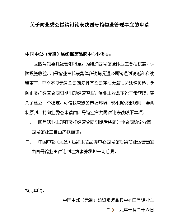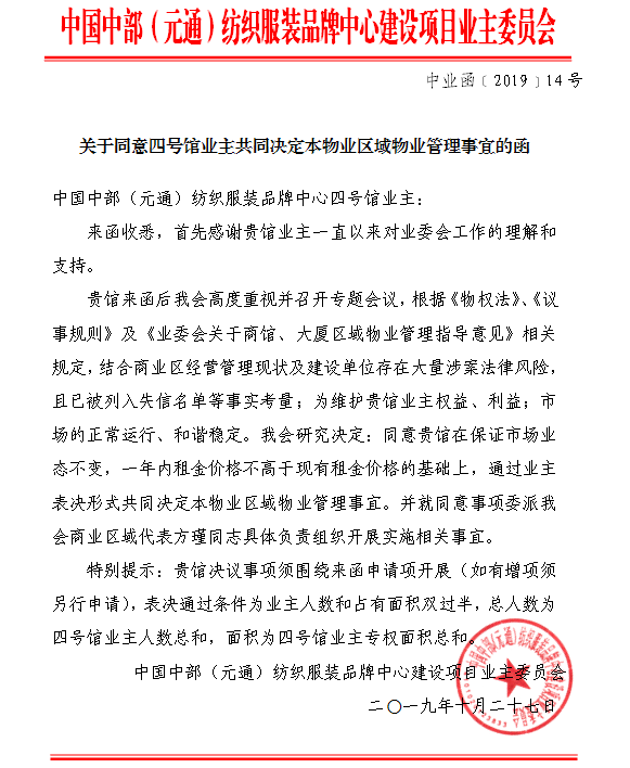 关于同意四号馆业主共同决定本物业区域物业管理事宜的函