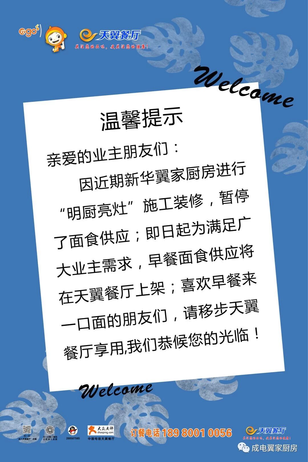 亲爱的业主朋友们: 因近期新华翼家厨房进行“明厨亮灶”施工装修,暂停了面食供应;即日起为满足广大业主需求,早餐面食供应将在天翼餐厅上架;喜欢早餐来一口...