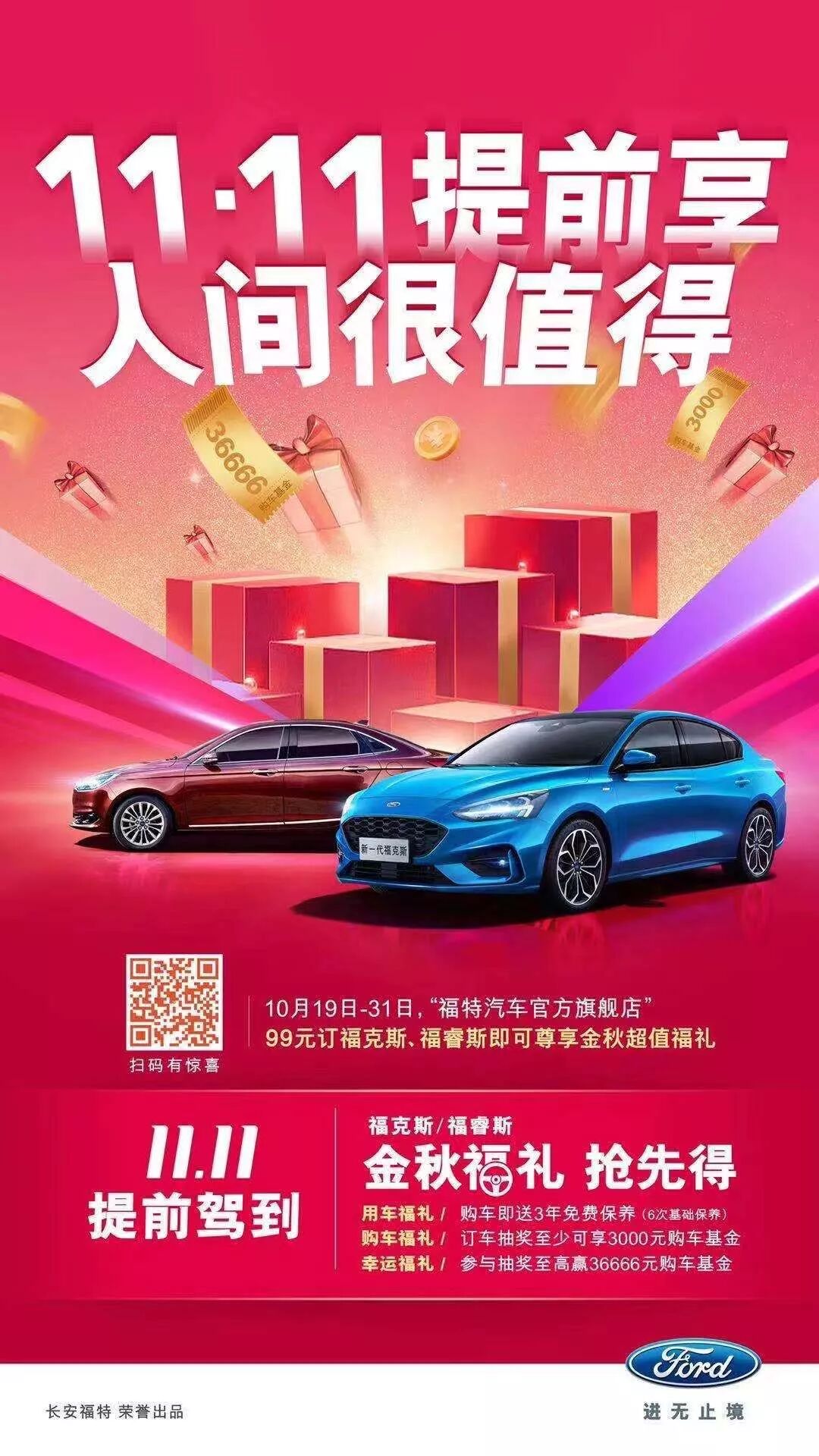 登录淘宝APP搜索福特天猫旗舰店选取中意车型线上支付99元即可参与赢取3000—36666元不等的购车基金至少可中3000元幸运可中36666元