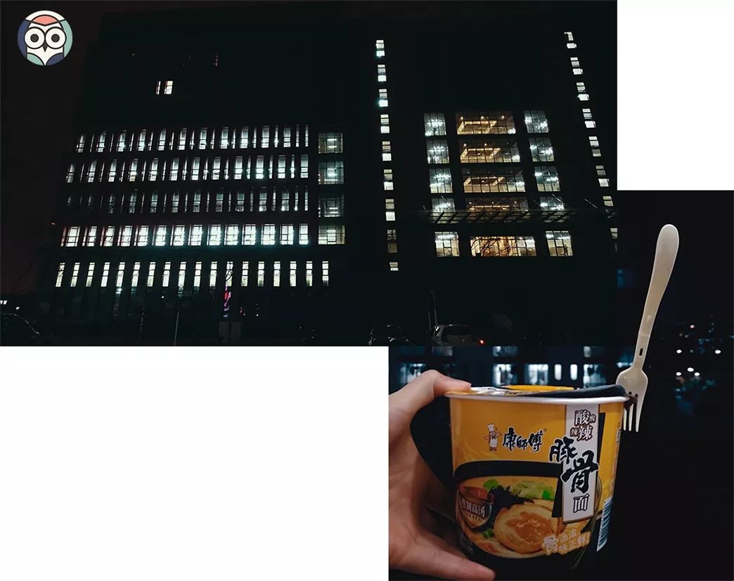 “你知道吗,有天晚上10点半图书馆关门了,我出来之后突然觉得有点饿了,于是去超市买了桶泡面。室友都睡着了,我就一个人在寝室泡了碗方便面吃。”