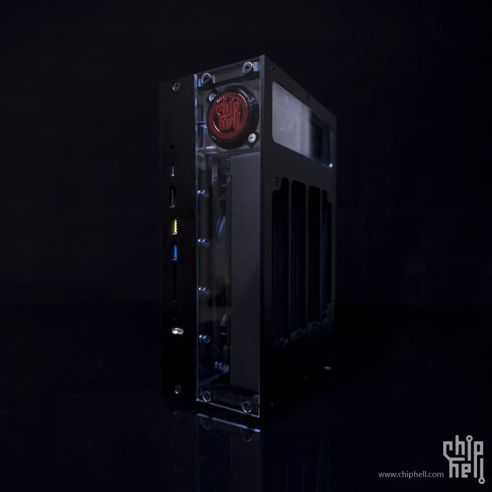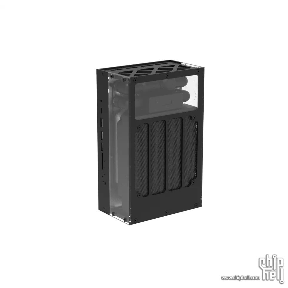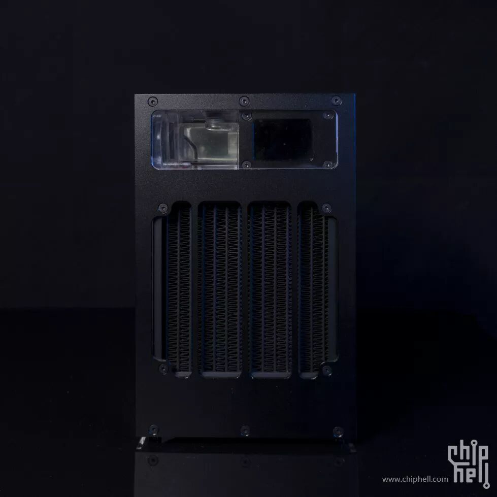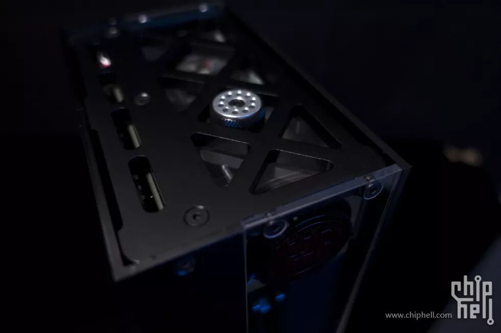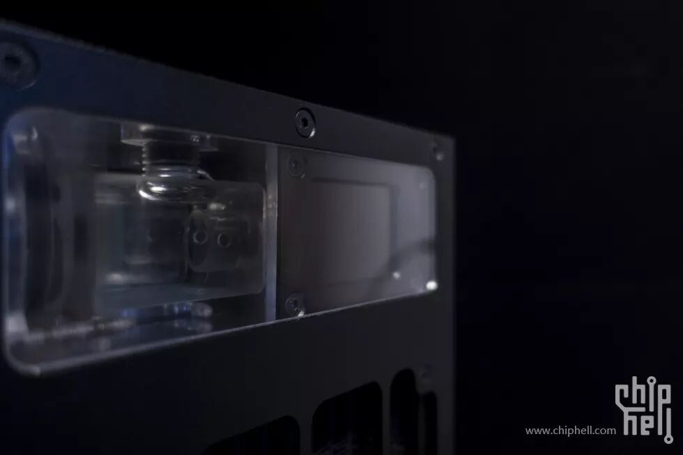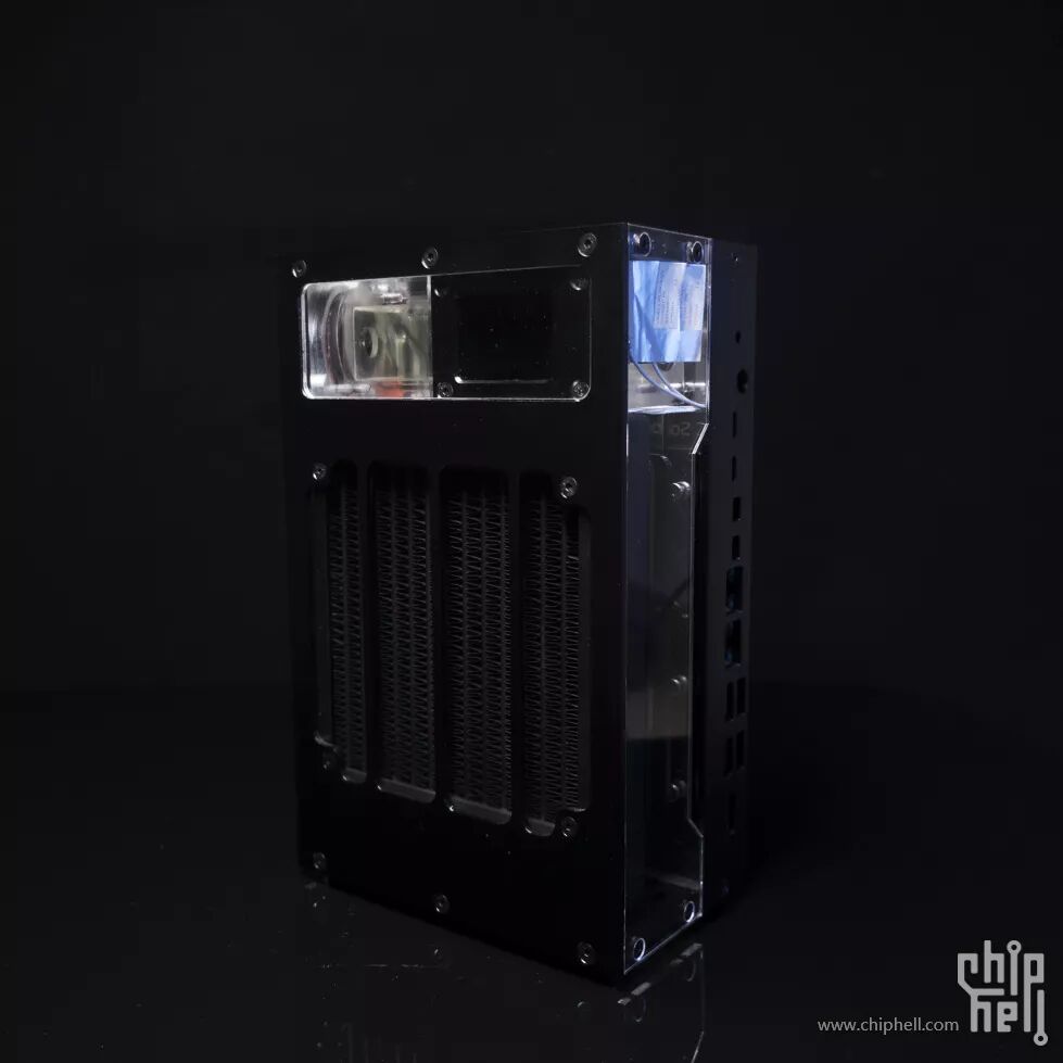 水冷系统仓的外壳是一块3mm铝板+三块亚克力板,正面,背面各一块亚克力板,可展现内部的水冷系统;铝板下部开孔为冷排出风孔,上部开孔用来嵌入一块亚克力板,便于观察内部的水箱以及温度计的屏幕。