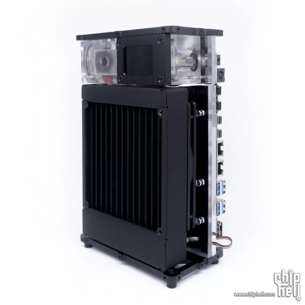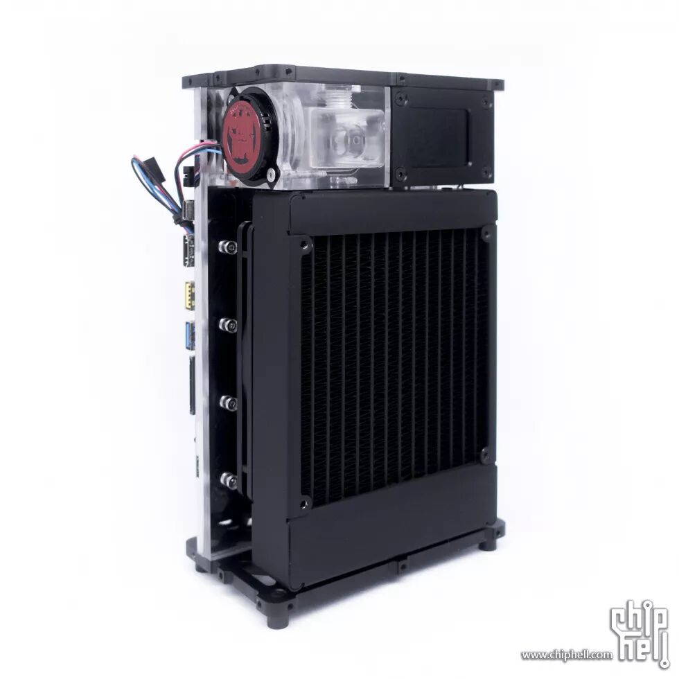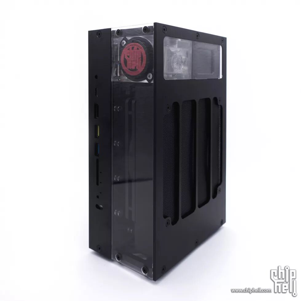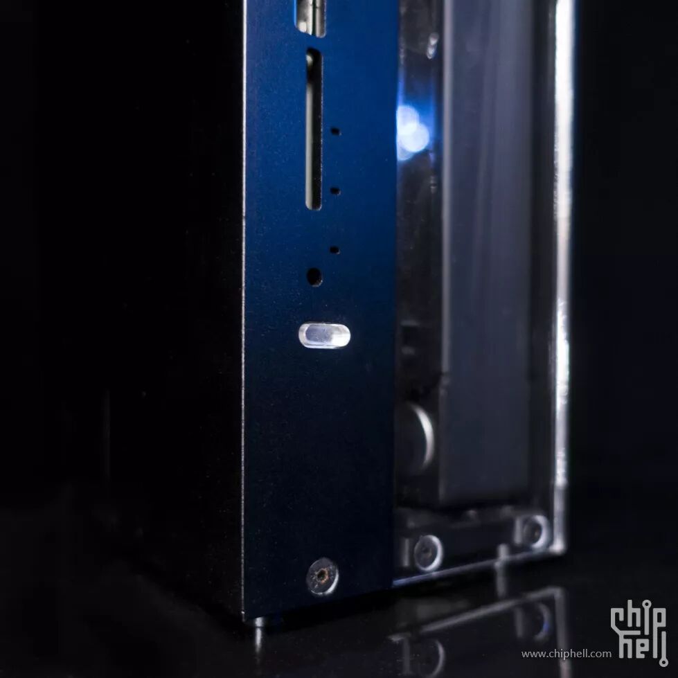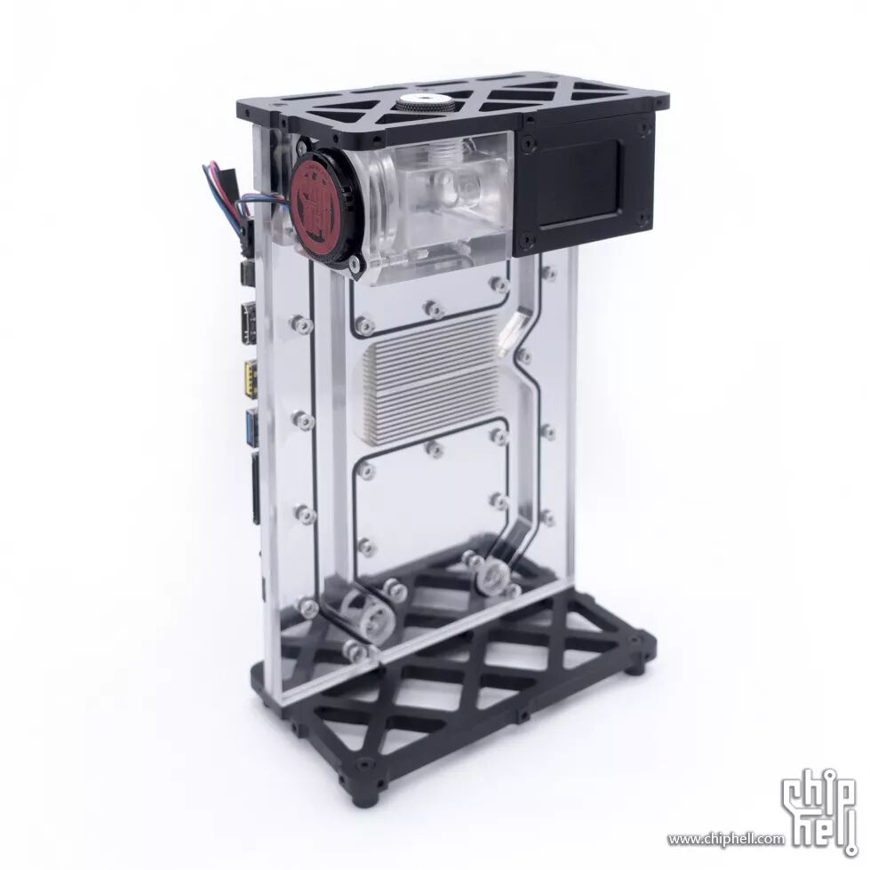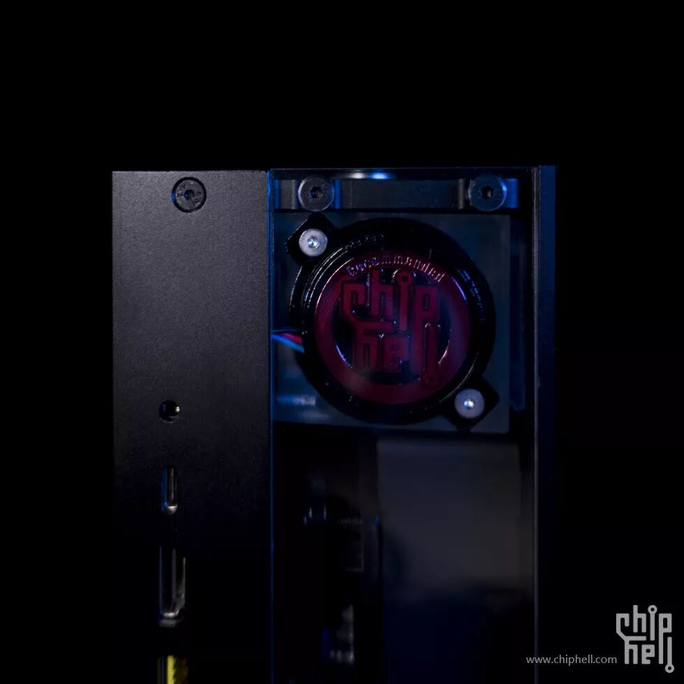 水冷系统仓的外壳是一块3mm铝板+三块亚克力板,正面,背面各一块亚克力板,可展现内部的水冷系统;铝板下部开孔为冷排出风孔,上部开孔用来嵌入一块亚克力板,便于观察内部的水箱以及温度计的屏幕。