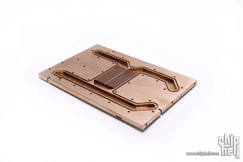 下图是紫铜做的冷头,中间是主板核心背面的密齿水道,四周是水道,水道改过好多个版本,尽量做到了简化,尽量提高冷却液流速和单位流量。水道外围一圈较窄的是安装密封圈的凹槽。