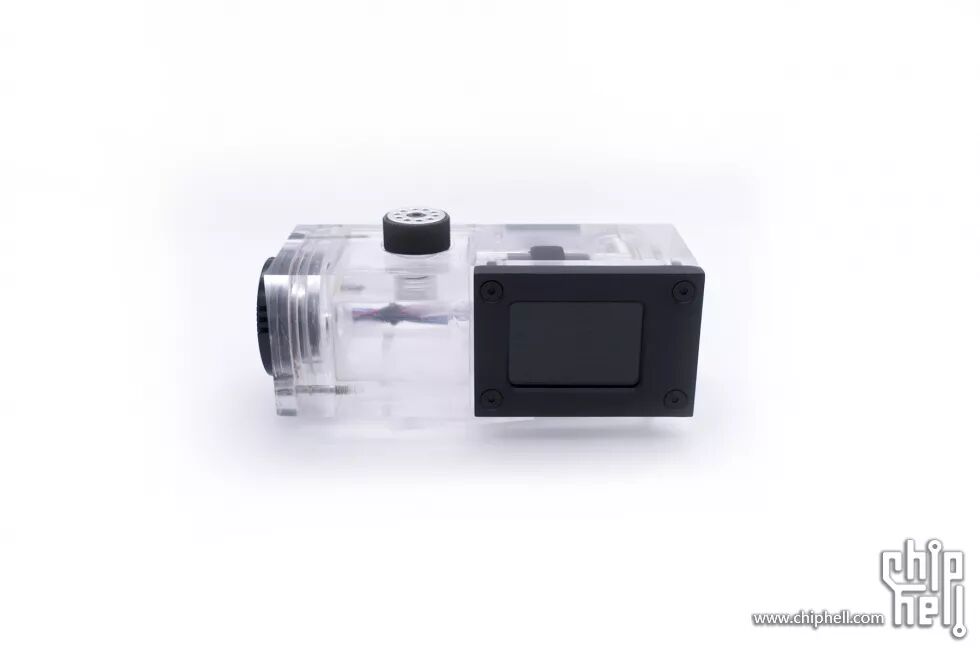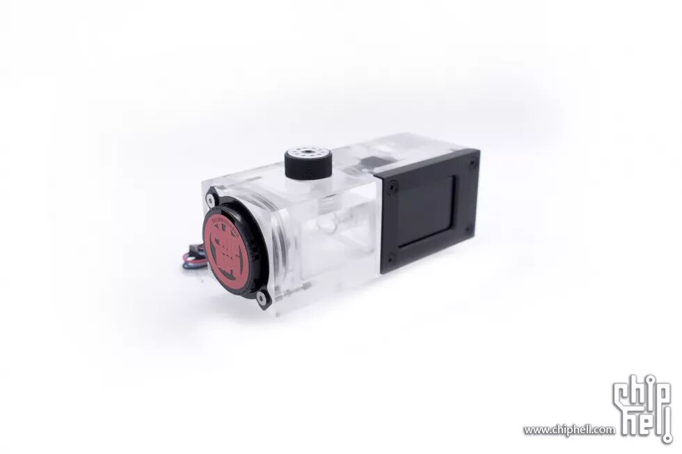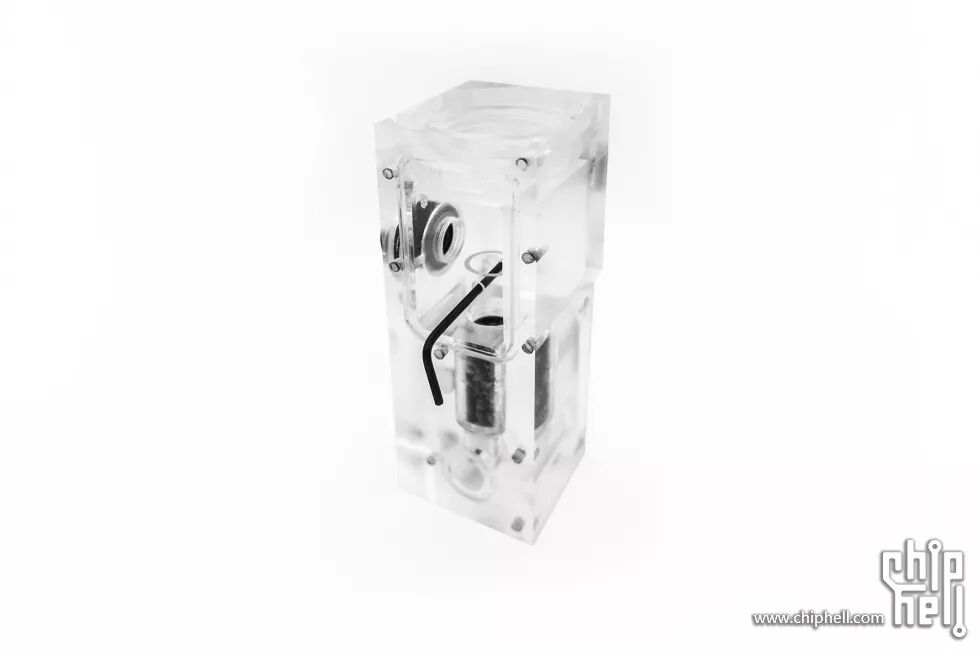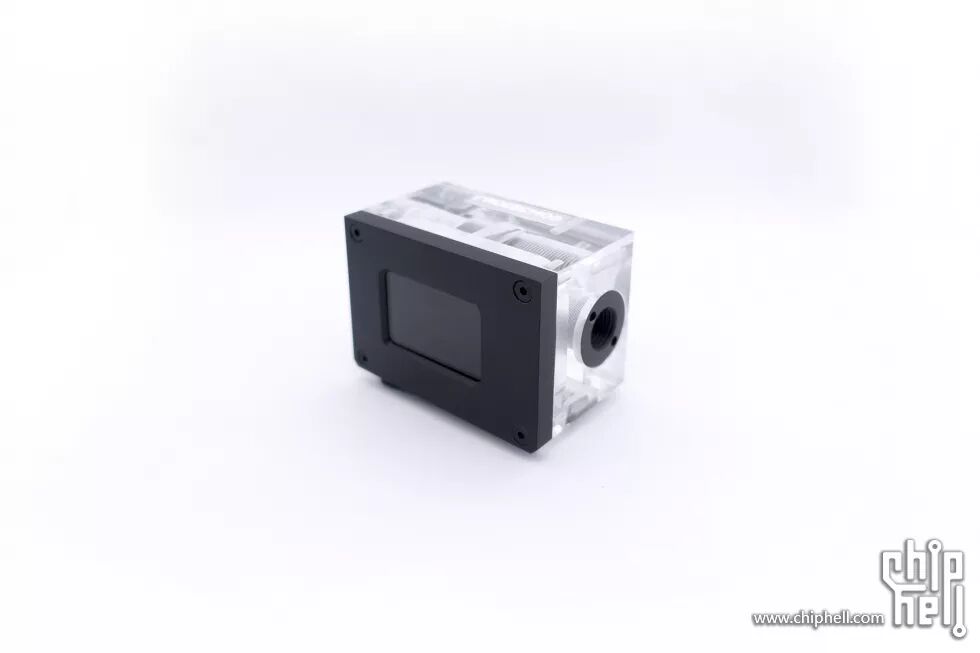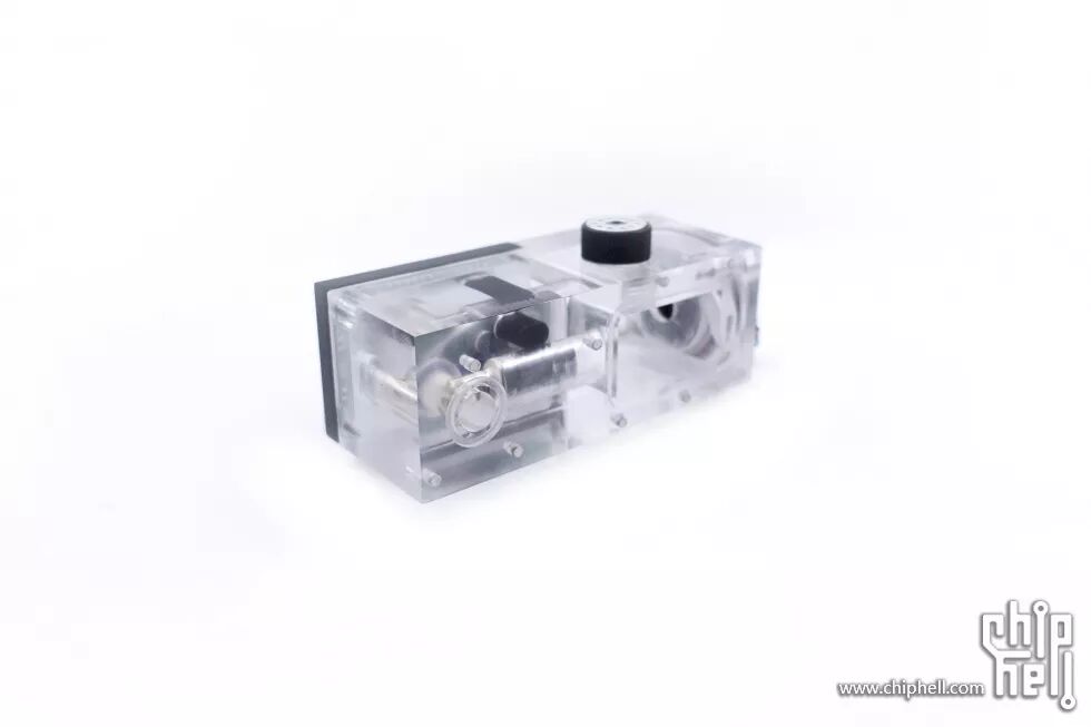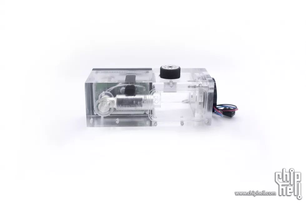 接下来是整个主机的另一大重要组件:集成泵盖、水温计、流速计等功能的水箱。整体使用亚克力制作的,左侧泵盖位置由于水道的原因,在制作的时候分成了三个组件,再使用无影胶粘接起来的。组合起来后再进行整体的打磨抛光。