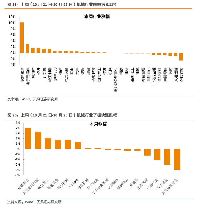 工程机械:9月汽车起重机销量2679台,同比增加9.21%,增速由负转正。9月挖掘机销量15,799台,同比+17.8%,1-9月累计179,195台,同比+14.7%,整体稳中有升,国产化率和行业集中度提升趋势延续。小松中国9月开机时间同比-3.6%,降幅较8月扩大0.5pct,整体可控。伴随国产化率和行业集中度提升,龙头增速高于行业增速,资产质量提升明显。重点推荐三一重工、浙江鼎力、恒立液压,关注中联重科、徐工机械、艾迪精密。