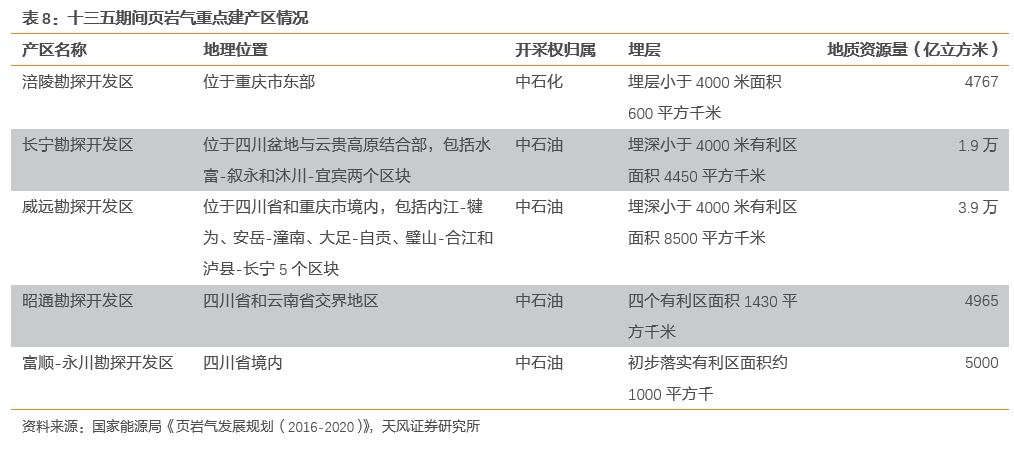根据国家能源局发布的《页岩气发展规划(2016-2020)》,力争在2020年实现页岩气产量300亿立方米,在2030年实现页岩气产量800-1000亿立方米。《规划》明确提出十三五期间努力推进涪陵、长宁、威远、昭通和富顺-永川5个页岩气重点建产区的产能建设,对宜汉-巫溪、荆门、川南、川东南、美姑-五指山和延安六个评价突破区加强开发评价和井组试验,适时启动规模开发,力争取得新突破。