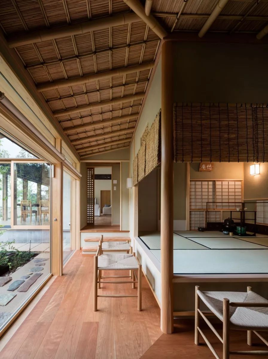 为了保证委托人在晚年也可以使用茶室,设计师在空间设计上采用了有序的通行路线,客人可以坐在椅子上喝茶。这个住宅的设计主题就是如何让客厅和茶室融洽地共享空间。