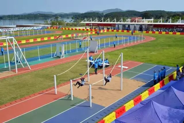 海军五项障碍跑赛道上的障碍物相比普通障碍赛更多样、更复杂,也更具有观赏性。其中,最具挑战性的当属绕柱跑,选手在完成6次360度的绕柱跑后,在眩晕状态下,需要马上进行手榴弹投准。男子障碍接力每队3人,比赛距离为305米,设置10个障碍物,女子障碍接力每队2人,距离280米,设置9个障碍物,队员完成互相拍手为接力成功。