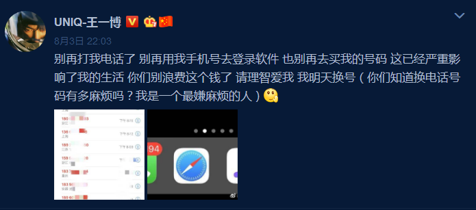 卖明星信息,包括航班信息、身份证信息、私人行程以及手机号。8月份,因为《陈情令》火了一把的王一博手机号被人给卖了,疯狂的粉丝不停拨打王一博的号码,导致他无法正常生活。