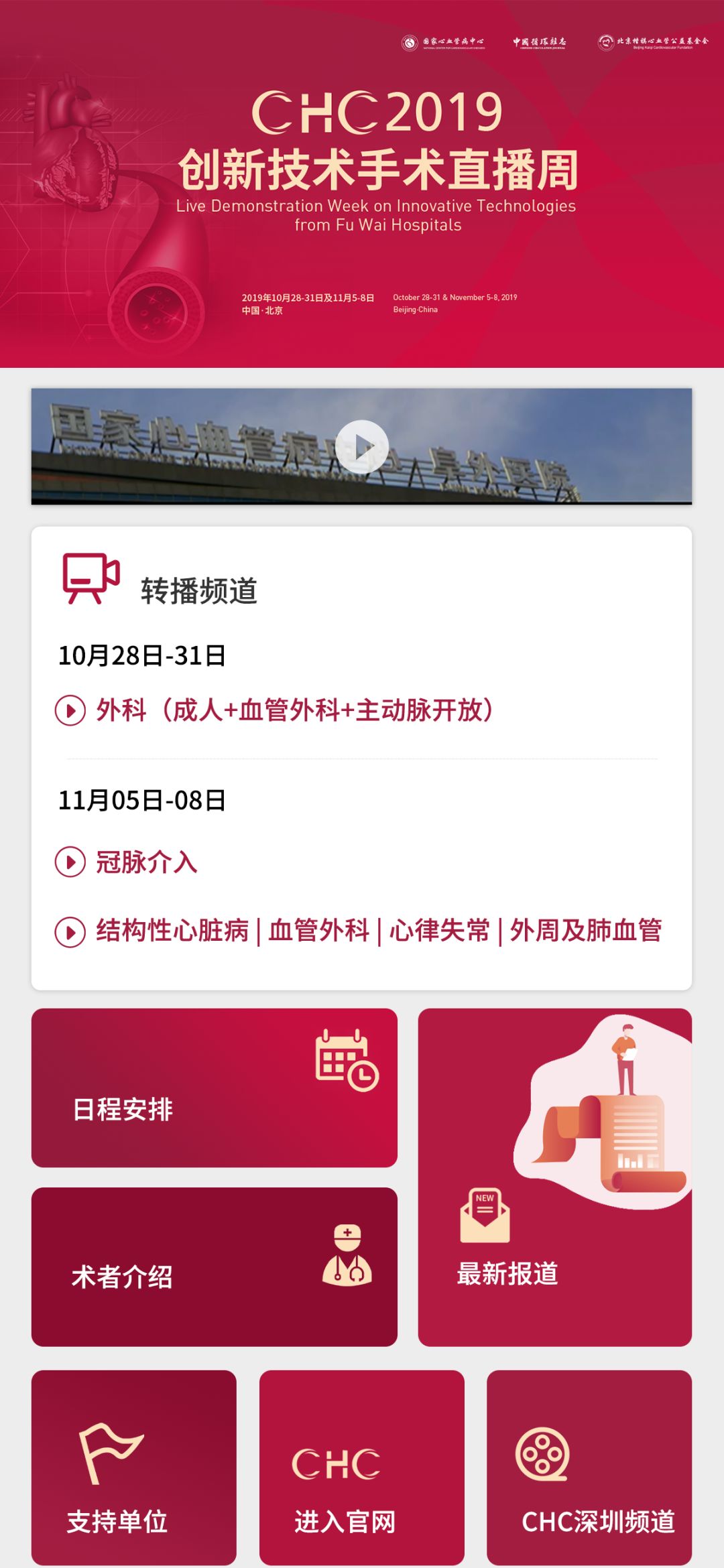 今年的CHC,特别安排为期两周的线上手术转播(10月28日-31日,11月5日-8日),领域涉及成人外科、冠脉介入,到结构性心脏病、心律失常、外周及肺血管……