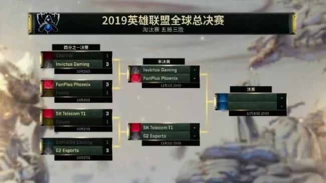 2019年10月28日消息 今日凌晨,英雄联盟S9全球总决赛八强赛正式落幕,欧洲赛区G2以3:1比分战胜LCK赛区DWG战队正式晋级四强。S9全球总决赛四强赛名单正式出炉,分别是IG、FPX、SKT、G2战队,其中IG、FPX战队将于11月2日19:00开始半决赛征战,SKT战队与G2战队将于11月3日19:00开启半决赛名单争夺,双方各自胜者将晋级全球总决赛冠军决赛。