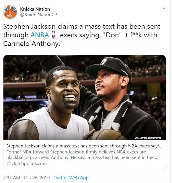 然而,当我们都以为联盟30支球队是因为这两点原因而不愿签下安东尼时,前勇士球员史蒂芬杰克逊今天在采访中爆了一个猛料:安东尼无球可打,是因为联盟告知所有球队不要签下安东尼。