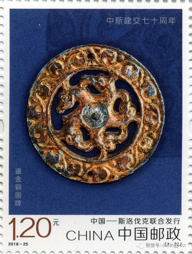 第二枚邮票画面表现为斯洛伐克方面的鎏金铜圆牌,是大摩拉维亚时期马夫所使用马具的一部分,圆牌为透雕的装饰风格,由缠枝植物纹组成,周围装饰围绕着五个兽头,这枚圆牌被镶嵌在铜带上,象征其主人的社会地位。 本套邮票设计为突出两件文物的质感,邮票采用深底色,背景则使用了瓦当图案作为辅助图形。