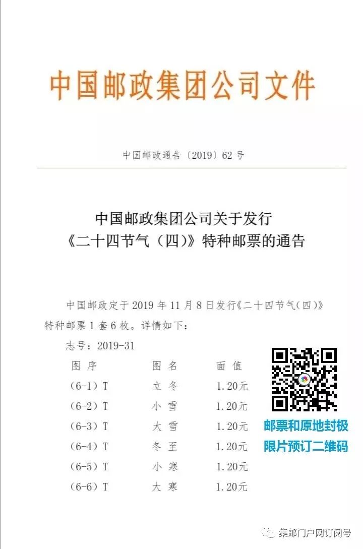 中国邮政定于2019年11月8日发行《二十四节气(四)》特种邮票1套6枚,全套邮票面值为7.20元。另特别制作《二十四节气》特殊版式小全张1枚,售价:43.20元。