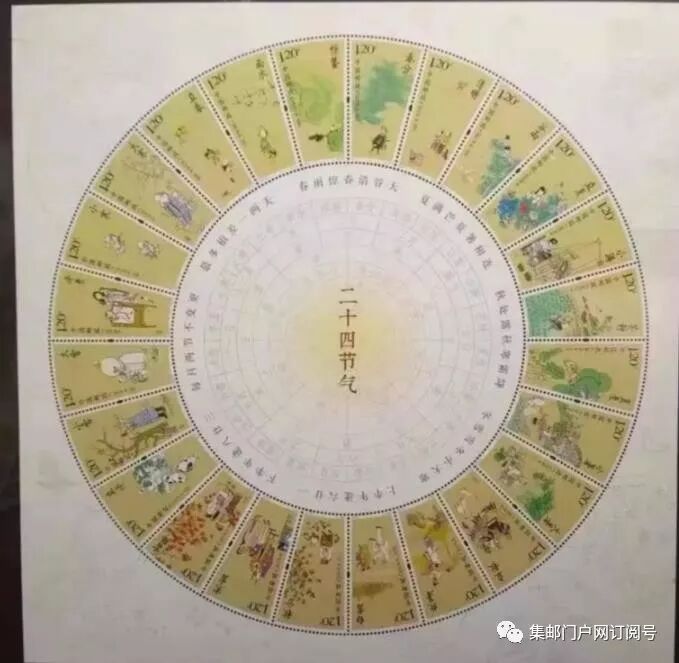 《二十四节气》特殊版式小全张在2015年《二十四节气》邮票启动时就已经完成了整体策划,将四套24枚邮票形成一个圆,既表达了地球是圆的,四季周而复始、气韵流动的理念,同时也传达了中国古代文化中圆满、圆融的概念。
