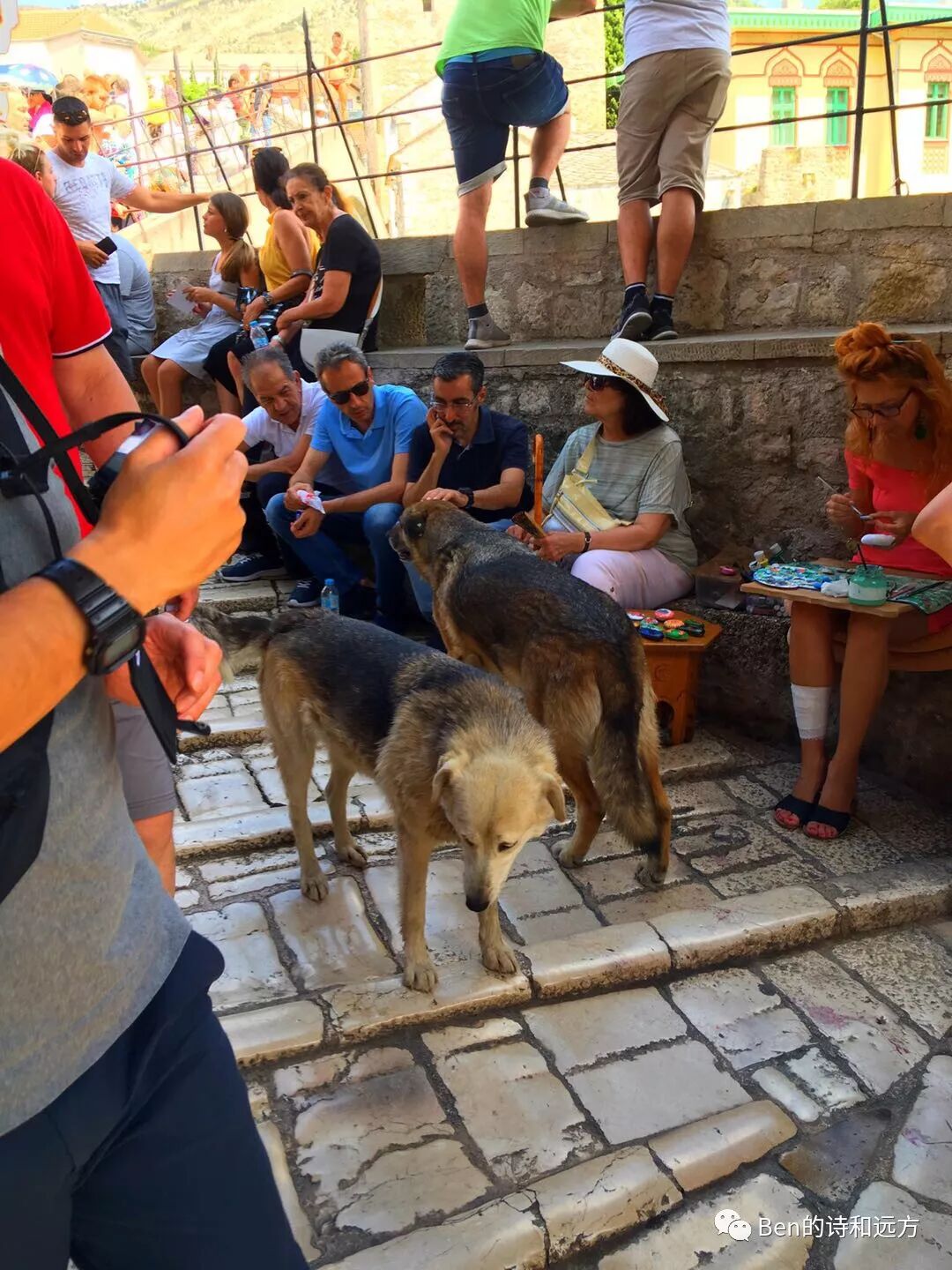 桥上两边坐满悠闲的人们,还有几条慵懒的狗。