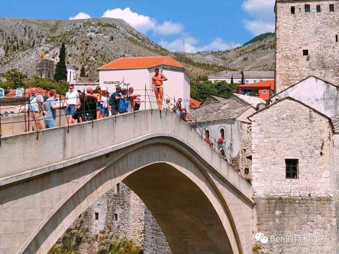 莫斯塔尔古桥跳水表演者,赤脚笔直地站在莫斯塔尔古桥的铁栏杆外侧,微微仰头,右手放在胸前,口中念念有词。祈祷完毕,他伸展双臂,双脚用力一蹬,纵身跃入河中,河水迅速吞没了他的身影 。很快,跳水者便浮出水面,缓缓游向岸边。稍做休息后,他再次走上古桥最高点,重复着日复一日的动作。桥上和河岸边的观众发出阵阵惊叹。这些来自世界各地的游客,因能亲睹古桥跳水而感到大饱眼福。古桥跳水是莫斯塔尔一项古老的活动。过去很长时间里,它是青年男子的成年仪式。
