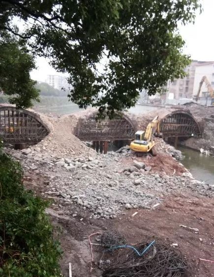 “萍实桥”日前己被“光头”并剥除了新旧外套,仅剩骨架――石拱了。――此次修缮,也只仅将保留其石拱部分。桥一端将加长1/4、两边各加宽10米,重新换上钢筋混凝土结构的最新套装!