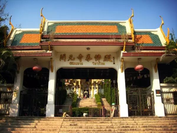 13点30参观【泰佛殿】泰国的寺庙有泰国艺术博物馆的美誉,在名城潮州建成的这座仿泰国云石寺的建筑物,极富泰国特色,重檐多面式屋顶装鱼鳞瓦、封檐板装向上的黄色图形,柱头翘角是龙凤呈祥之意,山墙的装饰、门窗的顶尖形集中了泰国古代的造型艺术,充分体现了雄奇、精巧的异国情调。