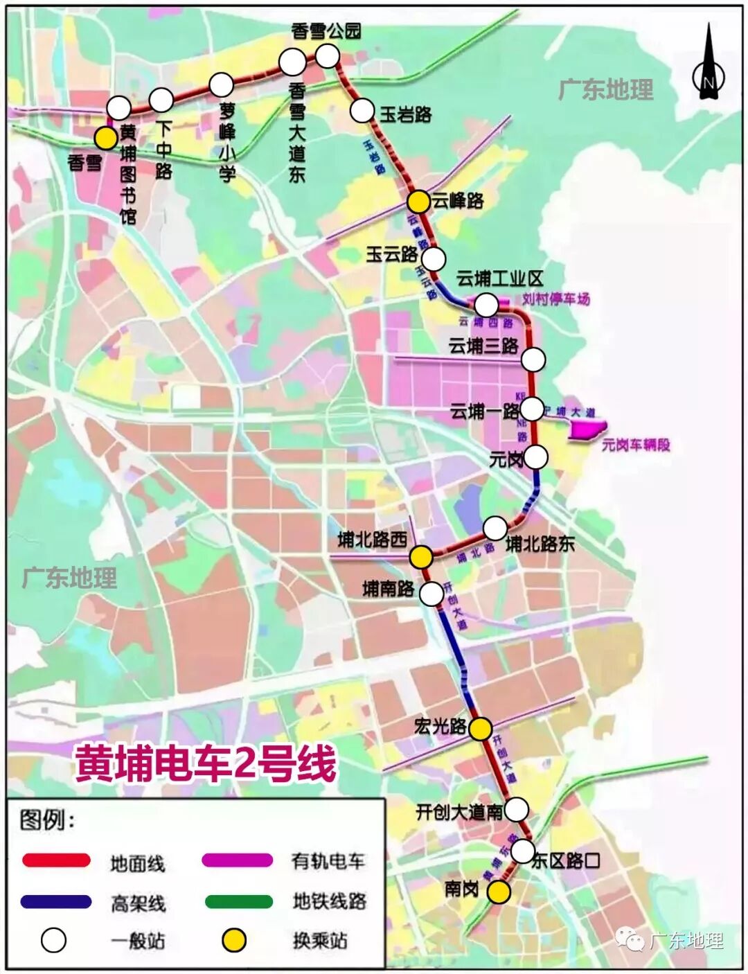 黄埔有轨电车2号线(香雪-南岗)为南北走向,衔接地铁六号线、十三号线。起始于香雪大道与开萝大道交会路口东侧的黄埔图书馆站,途经玉岩中学、黄埔区图书档案大楼、萝峰小学等。线路全长14.4公里,其中地面线12.15公里、高架线2.25公里。全线共设地面站19座。线路初期与黄埔有轨电车1号线在开萝大道段贯通运行,共用1号线香雪站。PPP项目的总投资暂定269504万元,合作期限为20年(其中建设期3年,运营期17年),计划2020年建成。预中标、成交社会资本为:中铁二十五局集团有限公司(牵头人)、广州地铁设计研究院股份有限公司、广州有轨电车有限责任公司、中铁建投资基金管理有限公司联合体。