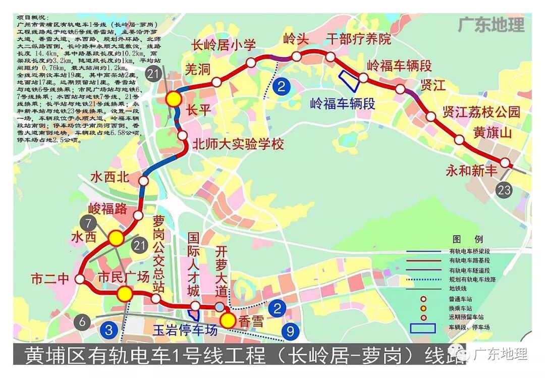 黄埔有轨电车1号线是广州黄埔区1号工程,也是广州市重点交通工程之一。线路全长约14.3公里,共20座车站,近期设站19座,其中高架站1座,地面站18座;远期预留地面站1座。线路起于香雪,终于永和新丰,主要沿开萝大道、香雪大道、水西路、规划外环路、北师大二纵路西侧、长岭路和永顺大道铺设。目前正在积极施工中,力争2019年国庆节永顺大道段试运行。