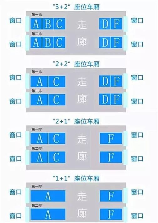 高铁座位分布图无论一等座还是二等座,带字母A和F的座位靠窗,带字母C和D的临过道。一拿到票就可以知道自己的座位是靠窗还是靠走廊。这样一来的话,你就可以很容易找到自己的座位,也可以知道你在购买车票的时候,座位的分布在哪个地方。