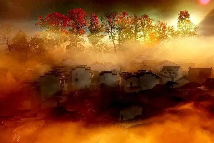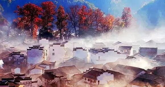【石城晨雾】 石城是婺源看秋色比较有名气的地方,源于的村落和红叶景观。灰白的民居与枫林交相辉映,形成了秋季婺源乡村别样的风光。几百株香枫树顶上的枫叶,由浅到深的颜色变换。形成了,层林尽染的美景。清晨雾气或炊烟中的火红枫树简直就美得不像人间植物了。
